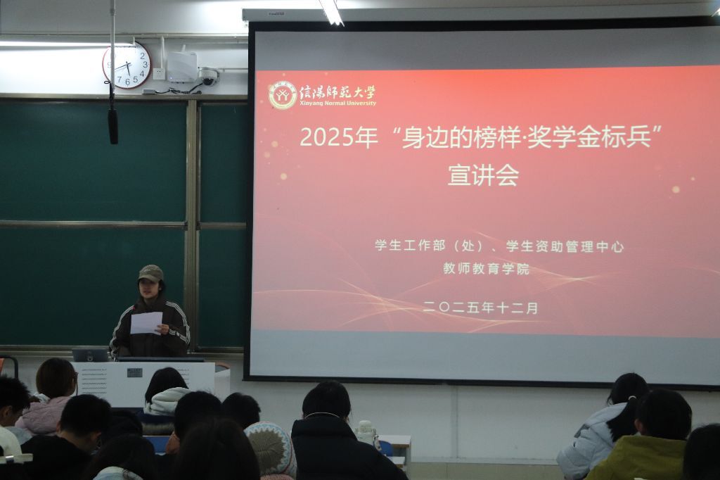 12月24日,教师教育学院于社科楼414教室举办2025年“身边的榜样·奖学金标兵”宣讲会。外国语学院郭郝冉、法学与社会学学院李萌以及国际教育学院于子涵三位奖学金标兵受邀作分享,教师教育学院全体学生到场聆听。